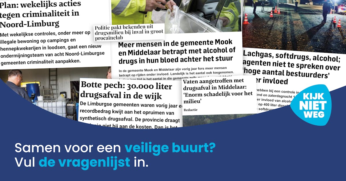 Als gemeente vinden we het belangrijk dat iedereen zich hier veilig voelt. Daarom willen we, samen met andere Noord-Limburgse gemeenten, weten hoe inwoners denken over veiligheid in hun buurt. Er is een vragenlijst gemaakt over georganiseerde criminaliteit en ondermijning. Het online invullen van de vragenlijst duurt slechts enkele minuten. De resultaten worden onder andere gebruikt om de campagne Kijk Niet Weg door te ontwikkelen.