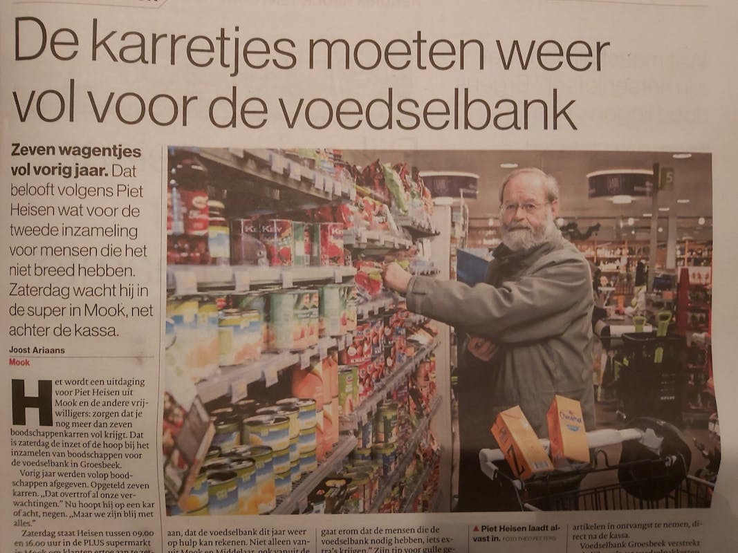 Mook - “Zo langzamerhand wordt het een decembertraditie. Een die ik liever niet had gehad! Maar we kunnen onze ogen niet sluiten voor de werkelijkheid.” Drie jaar geleden nam Piet Heisen uit Mook,fractielid PvdA Lokaal Sociaal, het initiatief voor de actie bij Wim Voet Plus Mook. “Wat werd er gul gegeven! Karren vol!” Daar hoopt Piet dit jaar weer op. Namens voedselbank Groesbeek heeft hij een wensenlijstje: “Koop alstublieft lang houdbare gezonde basisvoeding. Het liefst zilvervliesrijst, volkorenpasta’s, olijfolie, koffie, koffiepads, thee, potten/blikken groenten en fruit, vlees en vis. Gedroogde kruiden, volkorenontbijtkoek, enz. En ook maandverband, tampons en tandpasta. En voor deze dagen ook iets lekkers: kerstkoekjes en chocola.”