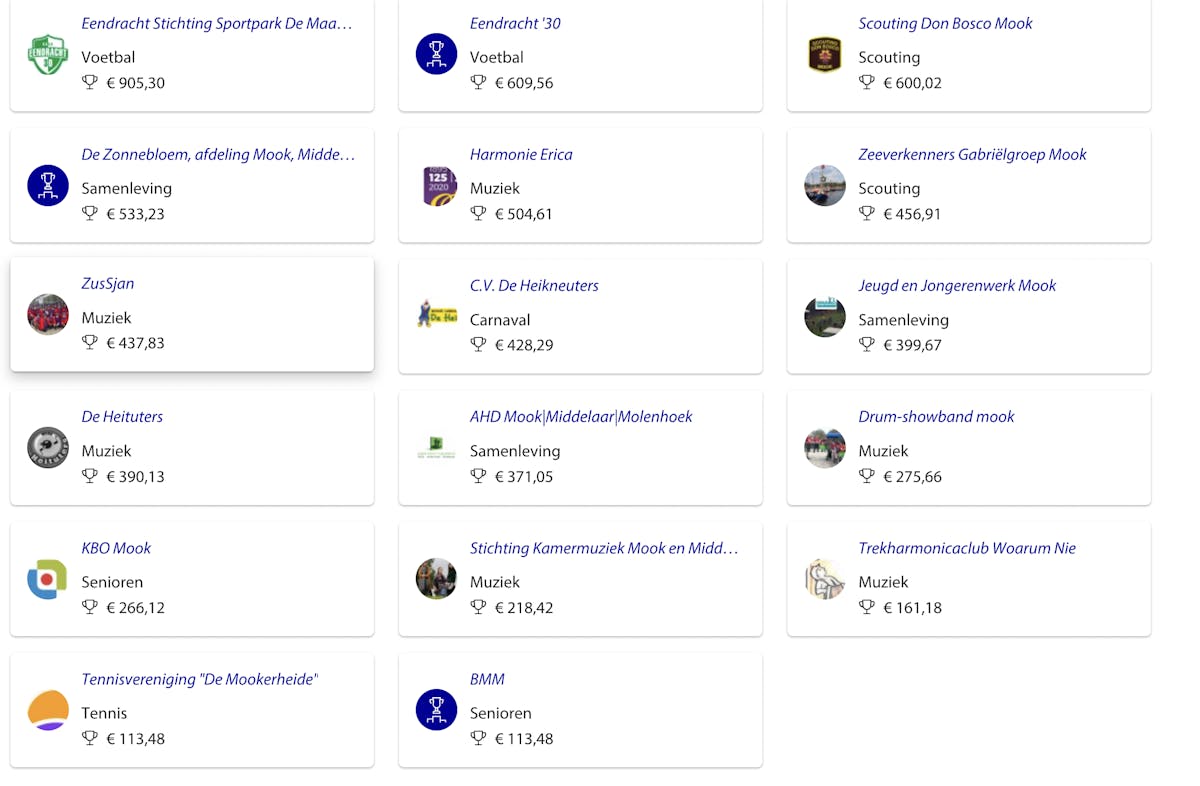 De top wordt, zoals eerdere jaren, gevormd door Eendracht die via twee aparte clubs, ruim € 1.500 op zijn rekening bijgeschreven krijgt. De Meulenwiekers, Don Bosco, de Zonnebloem, de Meulenbloazers en Harmonie Erica doen het ook niet slecht met een opbrengst groter dan € 500. Laagscoorders zijn de tennisclubs en het gilde in Middelaar.