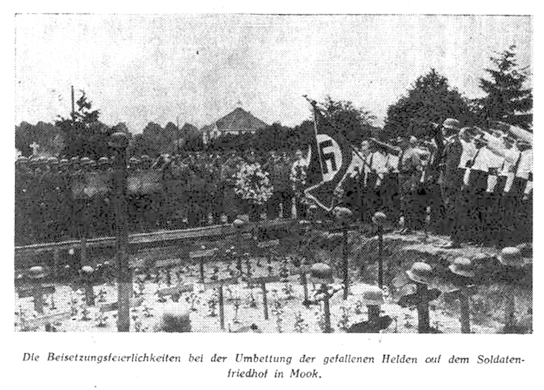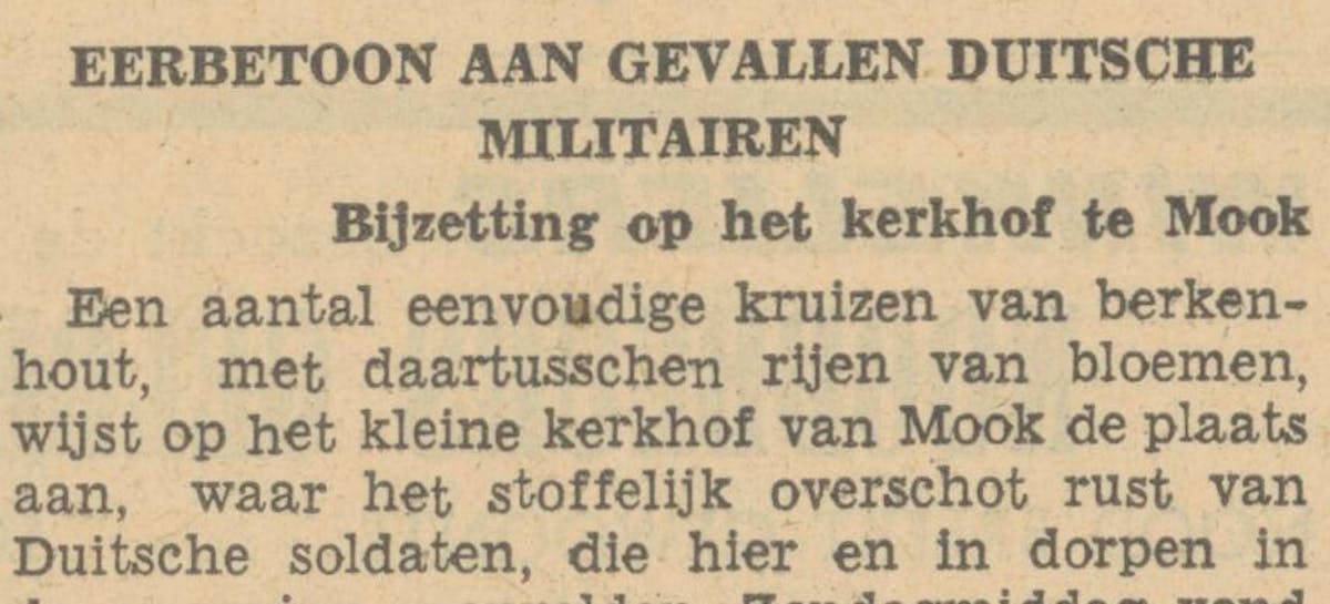 Een aantal eenvoudige kruizen van berkenhout, met daartusschen rijen van bloemen, wijst op het kleine kerkhof van Mook de plaats aan, waar het stoffelijk overschot rust van Duitsche soldaten, die hier en in dorpen in de omgeving sneuvelden. Zondagmiddag vond de officieele bijzetting plaats, een plechtigheid, welke door verschillende autoriteiten en deputaties en tal van andere belangstellenden werd bijgewoond. Zoo waren o.a. aanwezig de burgemeesters van Mook, Heumen, Gennep, Berchem, Haps, Beers en Mill en de politie uit deze plaatsen, verscheidene Duitsche officieren, Standartenführer Klein uit Kleef, deputaties van de Duitsche en Italiaansche kolonie uit Nijmegen, leden van de N. S. B uit Nijmegen, onder wie de districtsleider, de heer H. W. Paes, en de Hitler-jeugd uit Arnhem en Nijmegen, benevens de heer Bekker uit Nijmegen, die de bijzetting der gesneuvelden geregeld had. Fraaie kransen waren er van de Duitsche en Italiaansche kolonie, van de N. S. B„ van de Landesleitung Niederland der N. S. D. A. P. en van het Devisen Schutz Kommando uit Nijmegen. Nadat de officieele belangstellenden en de deputaties met hun vaandels zich rond de groeve hadden geschaard, een vuurpeleton van Duitsche soldaten in het front, trad pastoor van Haef uit Mook naar voren. Hij betoogde hoe zij, die hier hun laatste rustplaats vinden den vrede gevonden hebben. Hun offer kan niet tevergeefsch zijn. Moge er vrede komen voor alle volken en mogen de menschen voortaan leven in vrede. Bidden wij, zoo besloot spr., voor den vrede in de wereld een Onze Vader.