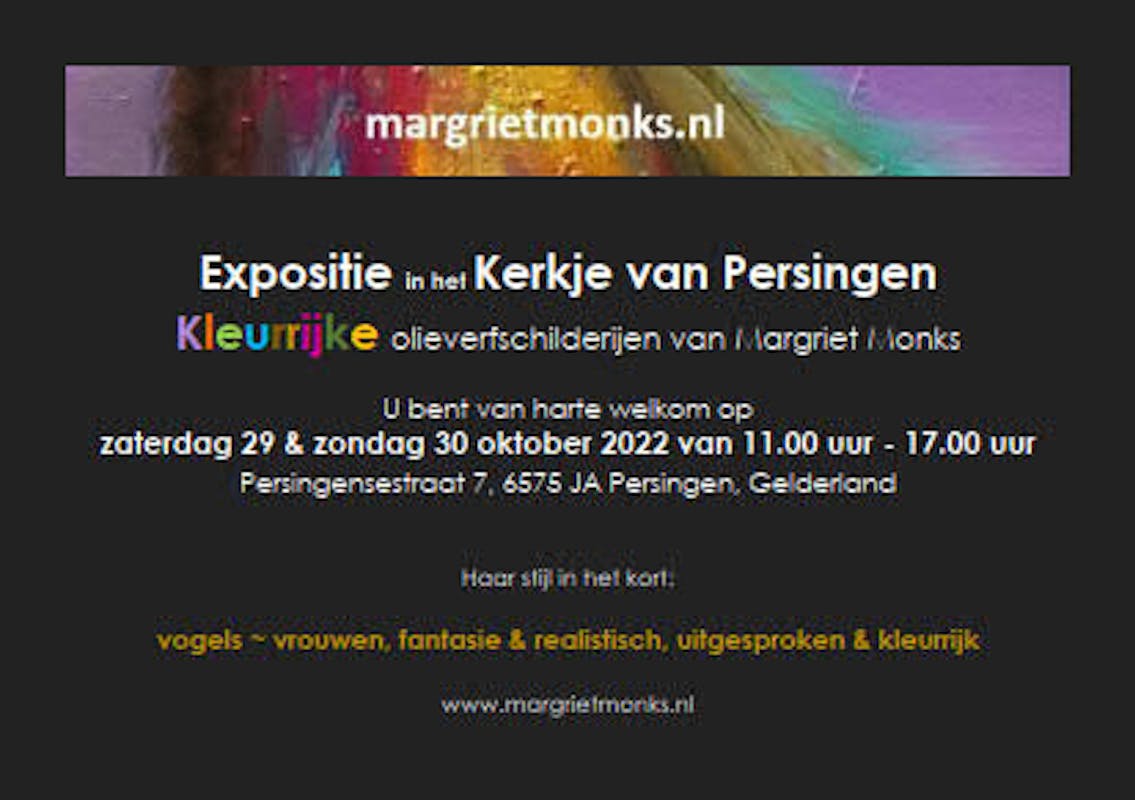 Voor de eerste keer exposeert Margriet Monks met haar kleurrijke olieverfschilderijen in het Kerkje van Persingen. U bent van harte welkom op zaterdag 29 & zondag 30 oktober 2022 van 11.00 uur - 17.00 uur.
