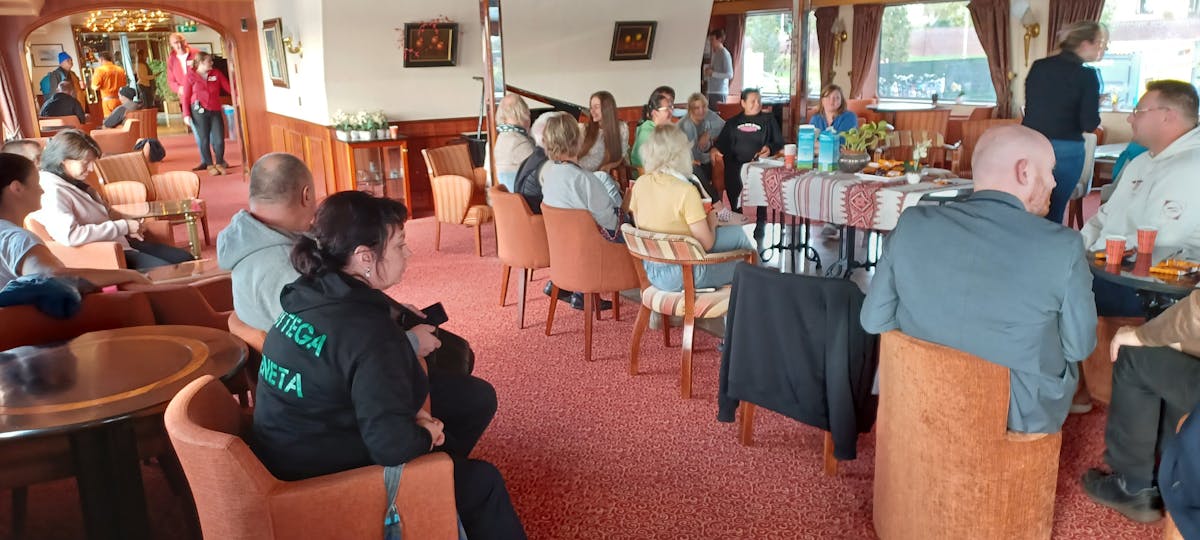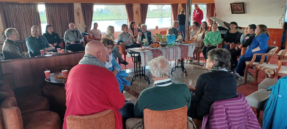 Een beetje onwennig komen enkele Oekraïeners de pianobar binnen. Het is dinsdag, en vanaf 4 uur 's middags staat er een bijzondere ontmoeting met de (over)buurtbewoners op het programma. Rond dat tijdstip lopen zij de loopplank op om kennis te maken met de nieuwe dorpsbewoners, een bijeenkomst die georganiseerd was door de gemeente, de crew van het schip en het Rode Kruis.