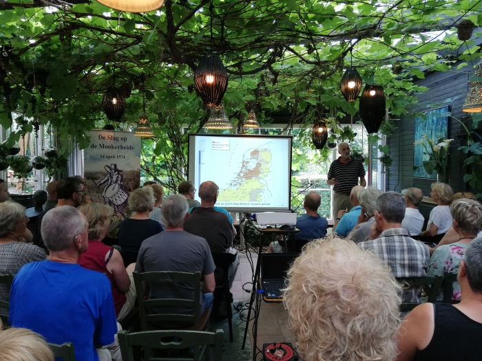 Wat me vooraf aansprak was de combinatie van theorie en praktijk of beter gezegd: van een presentatie gevolgd door een wandeling. Het theoretische gedeelte werd verzorgd door Theo van Brunschot. Hij zette de ontwikkelingen die leidden tot de 80-jarige oorlog en ook het verloop ervan, in een heldere presentatie neer. Doordat er ook aandacht was voor de context en het grotere geheel, werden de gebeurtenissen rondom Mook hier echt onderdeel van.
