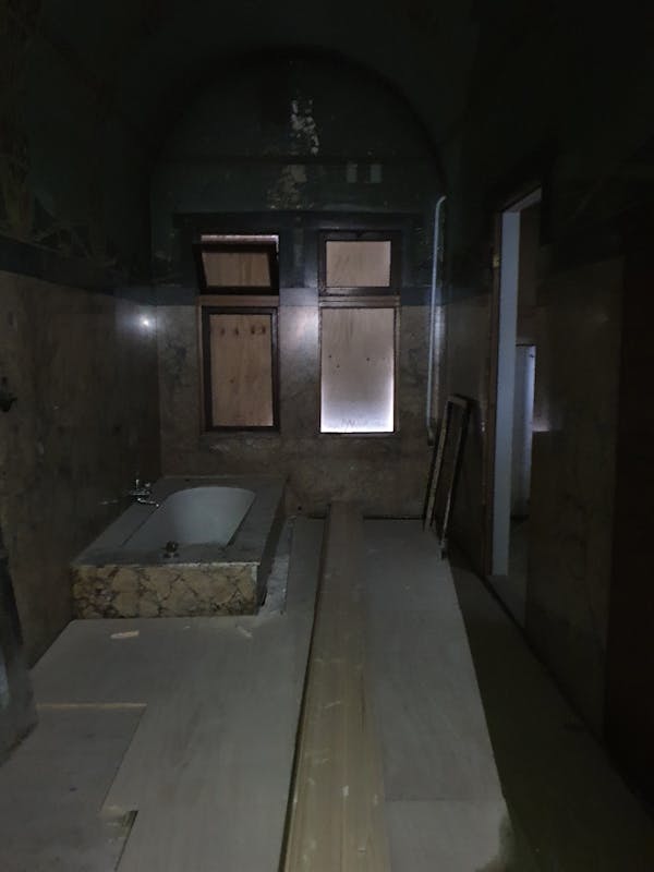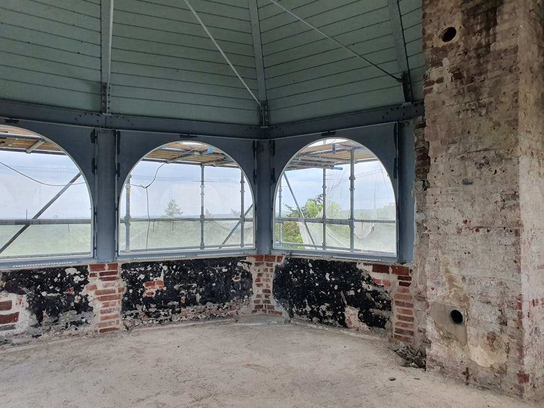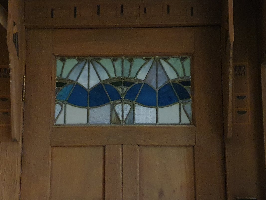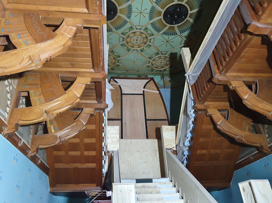 Bij de rondleiding zagen we hoe oude verflagen en timmerwerk verwijderd waren waardoor en de prachtige Art Nouveau onderdelen van het slot zichtbaar worden. De restauratie wordt gedaan door een gespecialiseerd aannemersbedrijf die met veel liefde voor zaken het pand weer in oude glorie hersteld.