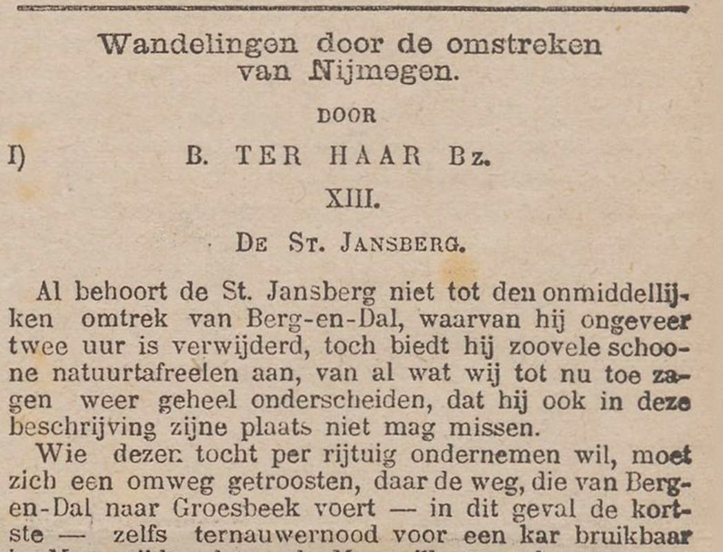 Al behoort de St. Jansberg niet tot de onmiddellijken omtrek van Berg-en-Dal, waarvan hij ongeveer twee uur is verwijderd, toch biedt hij zoovele schoone natuurtafreelen aan, van al wat wij tot nu toe zagen weer geheel onderscheiden, dat hij ook in deze beschrijving zijne plaats niet mag missen. Wie dezen tocht per rijtuig ondernemen wil, moet zich een omweg getroosten, daar de weg, die van Berg-en-Dal naar Groesbeek voert - in dit geval de kortste - zelfs ternauwernood voor een kar bruikbaar is. Men rijde door de Meerwijk naar den weg van Nijmegen op Groesbeek, ga vandaar op laatsgenoemd dorp en vervolgens door de buurtschap Grafwegen naar den St. Jansberg. Wie tegen de wandeling niet opziet, neme den reeds beschreven weg op Groesbeek en ga het dorp van de Noord- naar de Zuidzijde door. Den Zuidermolen aan de linkerhand voorbijgegaan, volge hij de Herwenzaadsche straat, die voor hem ligt en die hem na een half in de buurtschap Grafwegen voert, waar een spoor aan de rechterhand, dat over eene hofstede loopt en later tusschen bouwlanden doorkronkelt, hem eindelijk op den St. Jansberg zal brengen.