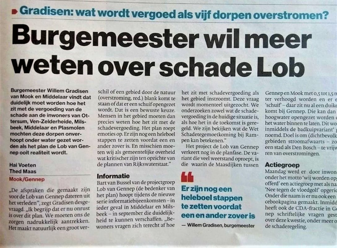 Het is gelukt! Dankzij het initiatief van Halina en Daphne: Lob Gennep staat op de kaart! Zondag 28 juli is gestart met de actie. Maandag ging de FB-pagina ‘Nee tegen de vloedgolf in de lucht.’ Het verhaal van het waarom werd meteen door diverse andere media opgepikt! Dinsdag artikel op de voorpagina van Gelderlander Rijk van Nijmegen. Vandaag burgemeester Willem Gradissen op de voorpagina van diezelfde krant. Ook hij heeft vragen. Op sociale media is er beweging en gaan mensen met elkaar in gesprek Het gaat goed. Binnen de kortste keren tientallen FB likers. De teller staat ondertussen op ruim 300. En ook mijn berichtje ‘Hallo Wakker worden” hier op Maasburen heeft al meer dan 400 weergaven. Goed te weten dat ik niet de enige was die zich bezorgd maakte.