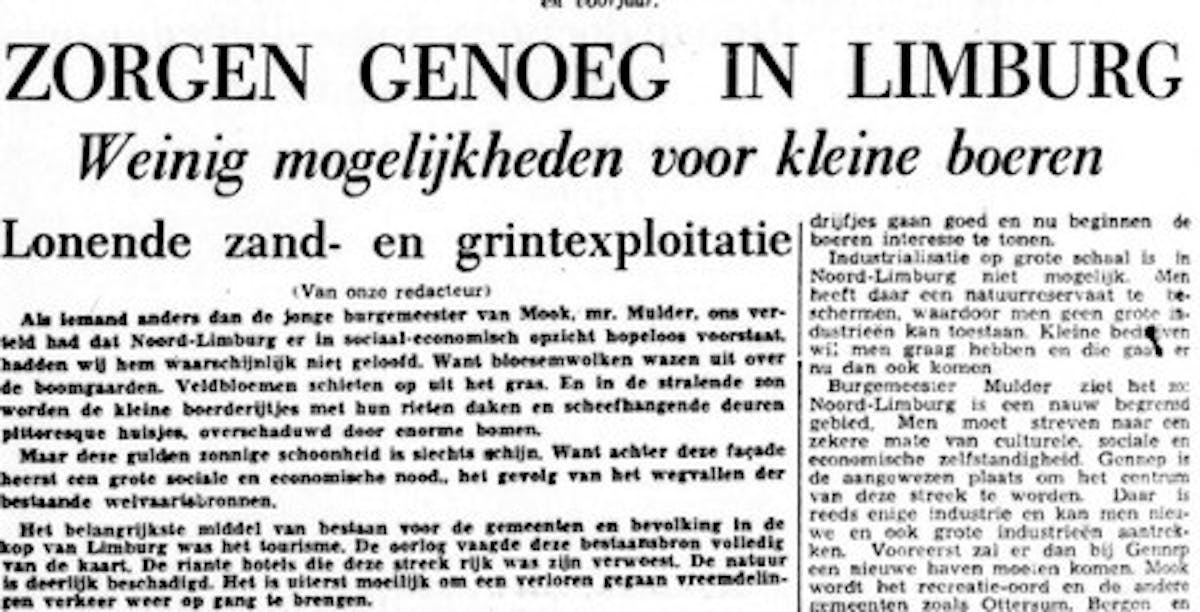 Als iemand anders dan de jonge burgemeester van Mook, mr. Mulder, ons verteld had dat Noord-Limburg er in sociaal-economisch opzicht hopeloos voorstaat, hadden we hem waarschijnlijk niet geloofd. Want bloesemwolken wazen uit over de boomgaarden. Veldbloemen schieten op uit het gras. En in de stralende zon worden de kleine boerderijtjes met hun rieten daken en scheefhangende deuren pittoresque huisjes, overschaduwd door enorme bomen. Maar deze gulden zonnige schoonheid is slechts schijn. Want achter deze façade heerst een grote sociale en economische nood, het gevolg van het wegvallen der bestaande welvaartsbronnen. Het belangrijkste middel van bestaan voor de gemeenten en bevolking in de kop van Limburg was het tourisme. De oorlog vaagde deze bestaansbron volledig van de kaart. De riante hotels die deze streek rijk was zijn verwoest. De natuur is deerlijk beschadigd. Het is uiterst moeilijk om een verloren gegaan vreemdelingenverkeer weer op gang te brengen.