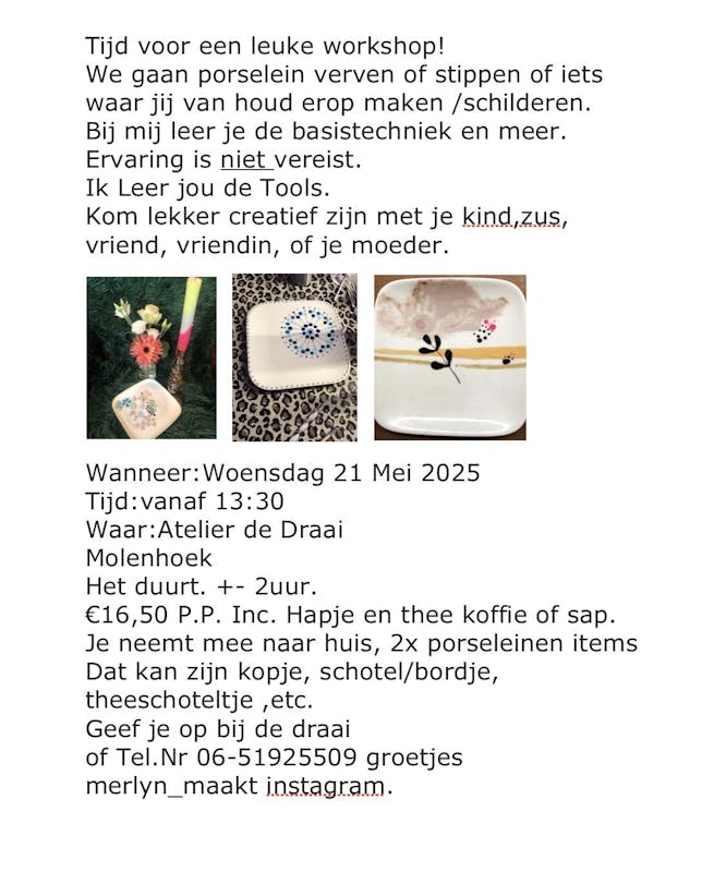 Deze workshop porselein verven/stippen op 21 mei, wordt gegeven door Merlyn bij atelier de Draai. Ze is te vinden op Instagram onder merlyn_maakt.