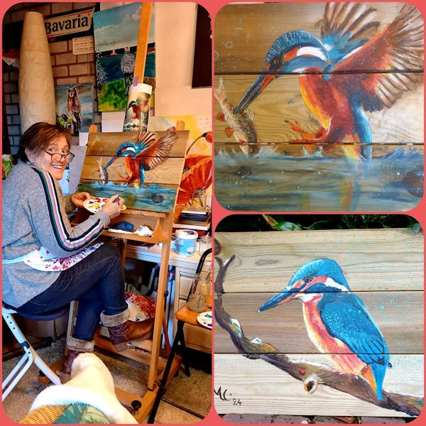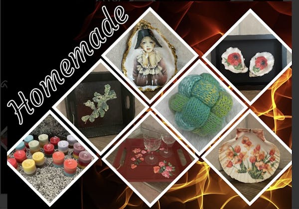 Decoupage schelpen(schilderijtjes), dienbladen, gebreide ballen, curiosa