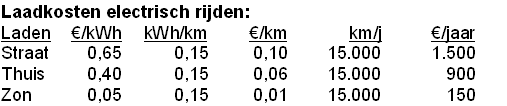 Een wandcontactdoos kost € 300. Na een verbruik van 1200 kWh ofwel 8000 km zijn de kosten eruit. De terugverdientijd is 23 maanden.