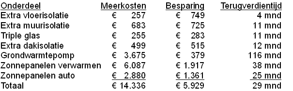 Onderstaand overzicht geeft een specificatie van de meerkosten, voor het 100 % energieneutraal maken van de woning. Er is voor de hoeveelheden uitgegaan van een gemiddelde woning in ons alternatieve plan. In de kosten is niet de normatieve standaard isolatie, maar de meerkosten voor de 50 % extra isolatie en de kosten voor een bron ten behoeve van een grondwarmtepomp opgenomen. Voorts de kosten van zonnepanelen voor het opladen van een elektrische auto, in plaats van via een openbare laadpaal, en de extra zonnepanelen voor verwarmen, ventileren en tapwater.