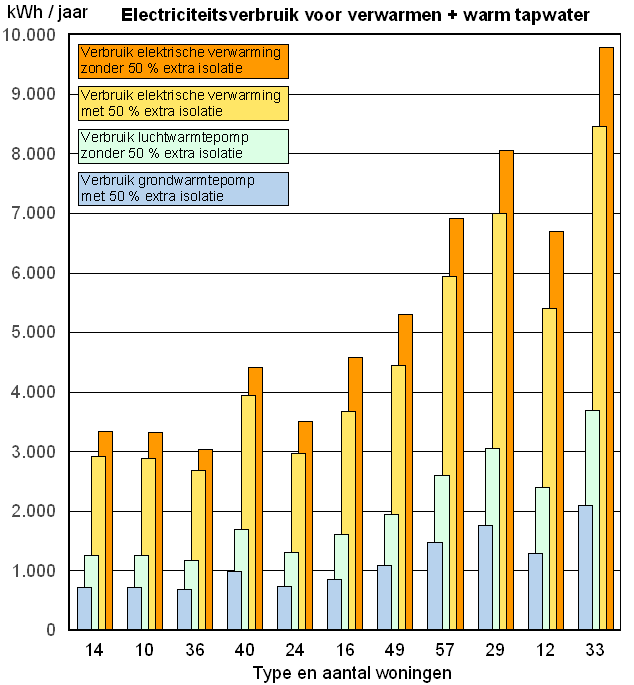 Luchtwarmtepomp of grondwarmtepomp: De lichtblauwe staven laten het stroomverbruik van een luchtwarmtepomp zien, met een rendement van 1 op 3,5 zonder extra isolatie. De donkerblauwe staven laten het jaarverbruik zien bij de toepassing van 50 % extra isolatie en een grondwarmtepomp met een rendement van 1 op 5,5. We zien dat het stroomverbruik in het laatste geval tot 80 % teruggebracht wordt. Reden waarom wij pleiten voor extra isolatie en de toepassing van een grondwarmtepomp.