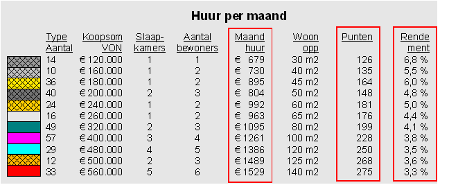 Investeerders: In het verleden hebben een aantal woningstichtingen verkeerde investeringen gedaan en moesten anderen hier jaren voor boeten, met als gevolg dat er de laatste 10 jaar te weinig huurwoningen gebouwd zijn. Door het maximeren van de huur wordt het nu ook voor een particuliere belegger steeds moeilijker gemaakt om een woning te kopen en daarna te verhuren. In de hiernaast afgebeelde tabel is het aanvangsrendement behorende bij het type woning opgenomen. Als we de marktrente hierop in mindering brengen, zien we dat alleen de kleinere woningen rendabel verhuurd kunnen worden.