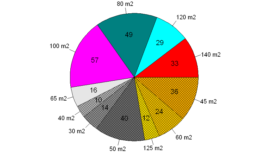 Woningen: In deze notitie zijn 11 verschillende typen woningen uitgewerkt. Deze woningtypen dienen ter illustratie en zijn gebruikt voor het bepalen van woonoppervlakten, bouwkosten, aantal slaapkamers, en de oppervlakten van daken, vloeren, gevels en kozijnen, alsmede het aantal zonnepanelen. De woningen hebben een breedte van 6 m en een diepte van ca 10 m met 1 of 2 bouwlagen, al dan niet met zolder, hellend of plat dak. De woningen varieren in oppervlakten van 30 tot 140 m2, met de aantallen cq typen, zoals in de hiernaast afgebeelde grafiek.