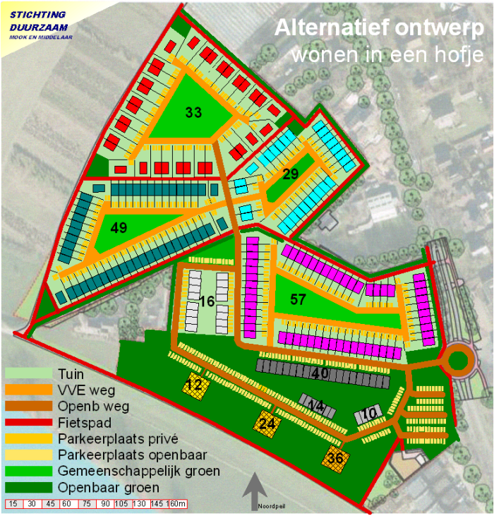 In de hieronder afgebeelde grafiek staat de verdeling van de grond voor het te ontwikkelen woongebied van 73.000 m2. In ons alternatieve plan bezuinigen we op de inrichting van de openbare ruimte. Dit doen we door niet alleen de percelen onder de woningtypen 33-49-57-29 ter grootte van 28.700 m2 aan de kopers uit te geven, maar ook de middenterreinen gelegen tussen deze woningen, groot 10.900 m2, in eigendom over te dragen aan de hiervoor op te richten VVE‘s. De gemeente kan via de ontwikkelaar met de vier VVE‘s afspraken maken. Bijvoorbeeld over de bereikbaarheid van deze binnenhofjes voor hulpdiensten tot en met de opstelplaatsen voor de kliko‘s.