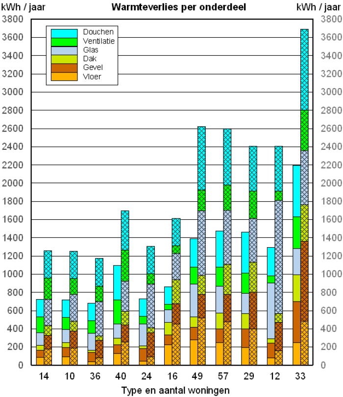 Isoleren is rendabel: In de grafiek hieronder, een weergave van het warmteverlies van alle onderdelen per type woning. Bij de laagste staven zijn de woningen voorzien van 50 % extra isolatie en een grondwarmtepomp. De hoogste, tevens gearceerde staven, zijn de woningen volgens de norm geïsoleerd en voorzien van een luchtwarmtepomp. Uit deze grafiek blijkt dat na verbetering van de isolatie en de toepassing van een grondwarmtepomp met een hoog rendement, de energiekosten voor de bewoners veel lager zijn. Eerder hebben we ook gezien dat deze investering rendabel is.