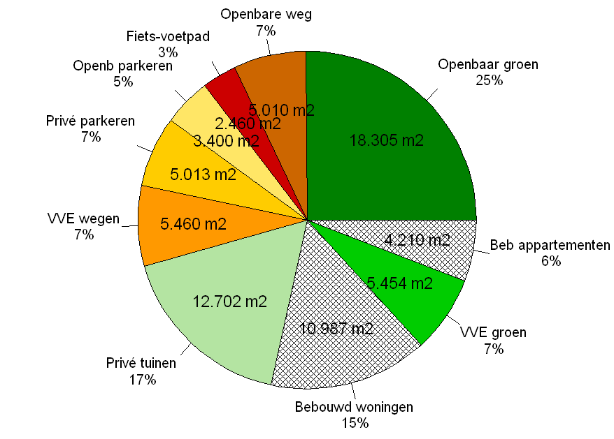 15 % is openbare bestrating: Dit bestaat uit de openbare hoofd ontsluitingsweg, de fiets-voetpaden en de openbare parkeerplaatsen bij de appartementen.