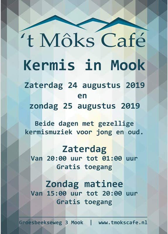 Op het dorpsplein in Mook lekker zwieren en zwaaien van 12 tot 22 uur en in het Moks Café op 24 en 25 augustus, even bijkletsen met gezellige kermis muziek erbij