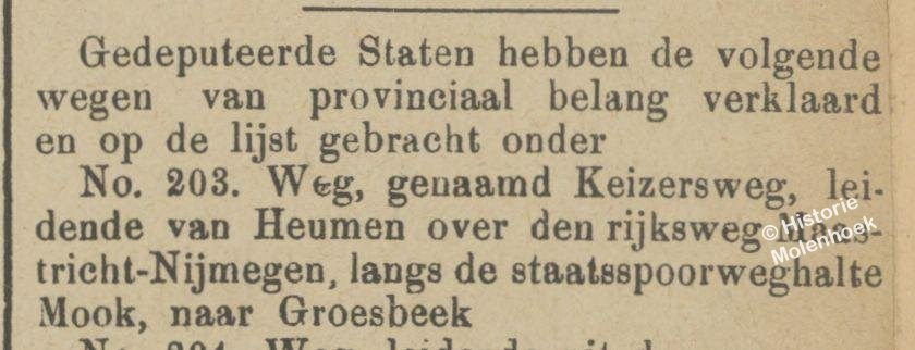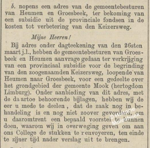 Zowel de gemeente Groesbeek als de gemeente Heumen hebben een aantal jaren meebetaald aan het onderhoud van de oude Keizersweg in Molenhoek, kennelijk omdat het bestuur van de gemeente Mook en Middelaar op het standpunt stond dat het hier om een gedeelte van een doorgaande verbindingsweg ging waar de inwoners van Groesbeek en Heumen meer belang bij hadden dan de inwoners van Mook en Middelaar.